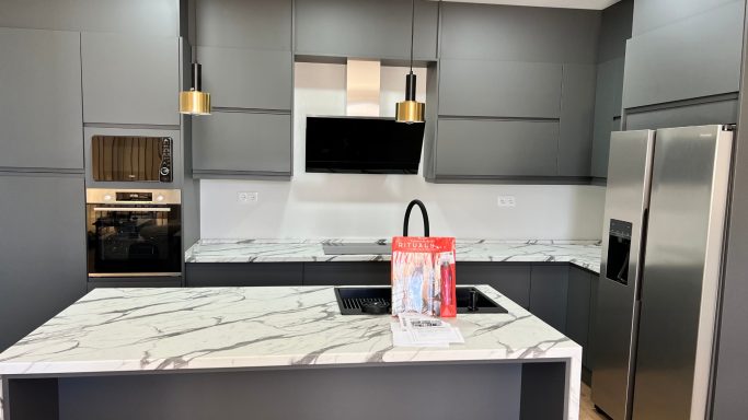 Área de cocina Office + zona de descanso (56 m²): Cocina minimalista en tonos gris y blanco marmolado, completamente nueva y equipada con electrodomésticos de alta calidad (campana, microondas, horno, frigorífico americano). Destaca una gran isla central de madera con encimera marmolada, unida a un acogedor área de descanso, creando un espacio perfecto para el bienestar del equipo.