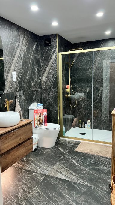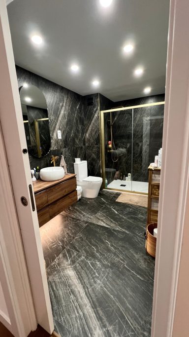 Baño (9 m²): Elegante acabado en gris marmolado, iluminación LED integrada en espejos, mampara de ducha con perfilería dorada y muebles en roble de diseño.
